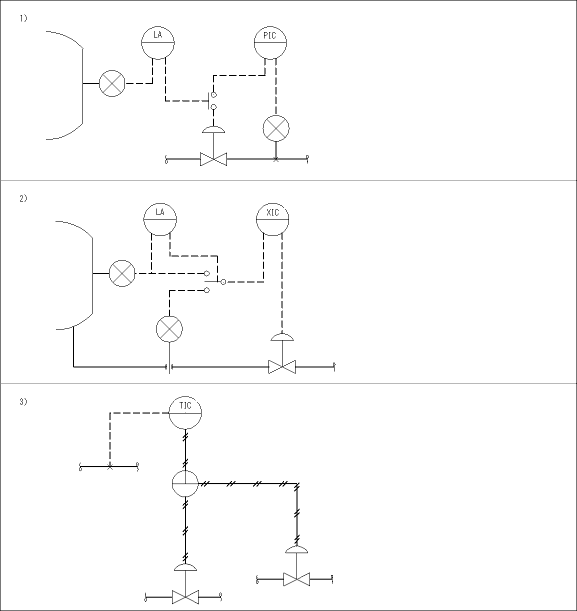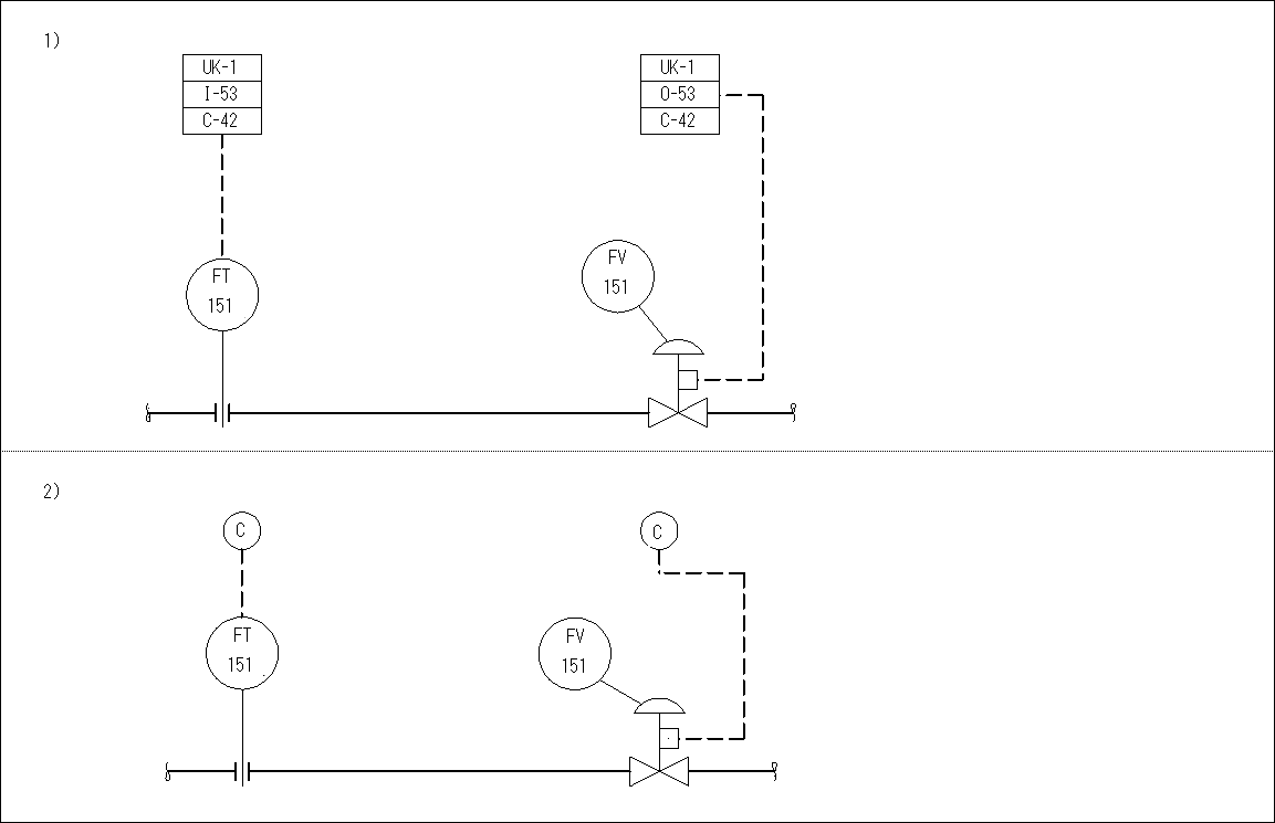 - 検出器、伝送器、および調節部が、表示計器または調節器に接続されている場合には、それらの各々に文字記号および個別番号を記入する必要はありません。