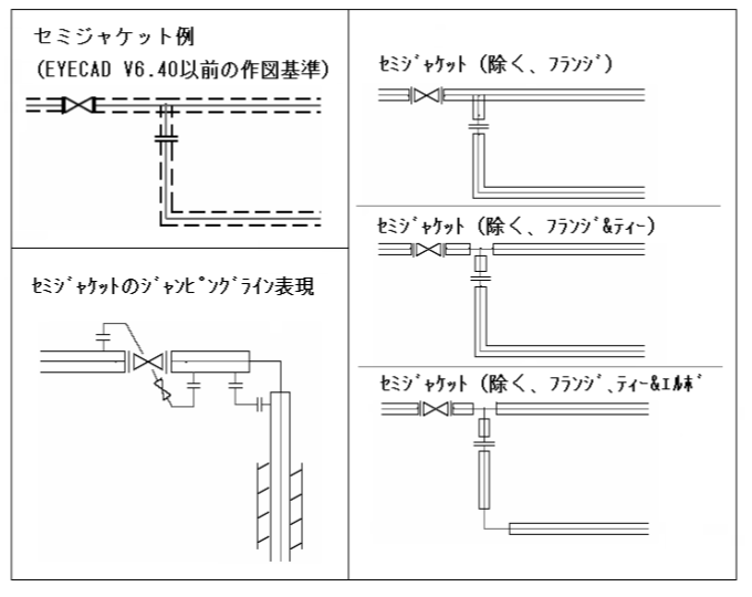 EYEPID-V6.40以前では、実線(内管)&破線(外管)を作図基準としてきました。(「線種」参照)しかし、視覚上より分かりやすい手法(下図参照)も広く運用されていますので、これらもセミジャケット配管の作図基準とみなします。
