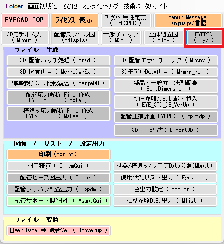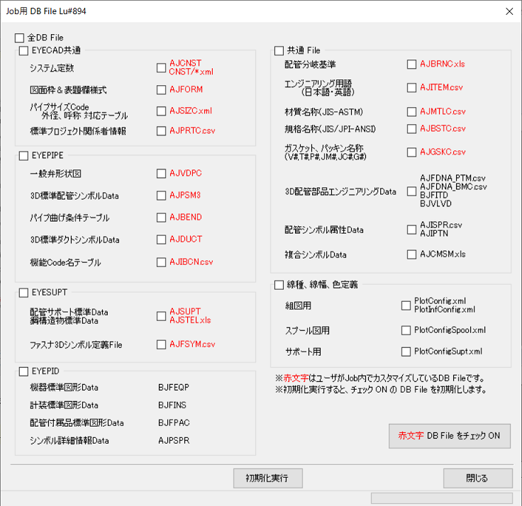 - [全DB File]にチェックを付けるとすべてのファイルにチェックマークが付きます。また、[EYECAD共通]/[EYEPIPE]/[EYESUPT]などグループごとにチェックマークを付けることもできます。