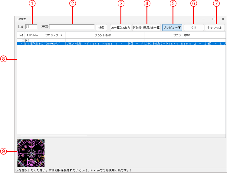 ※内容を確認したい場合は、プレビュー(⑤)をクリックするとLu#リストの下(⑨)にプレビュー画像が表示されます。