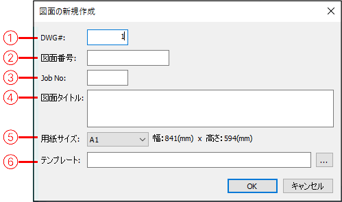 - 「⑥テンプレート」は「①DWG#」が1000以上のとき指定可能です。テンプレートを指定するとそのデフォルトレイアウトから用紙サイズを決めるため「⑤用紙サイズ」の設定は無視されます。レイアウトが存在しない場合、テンプレートで設定された用紙サイズを使用します。