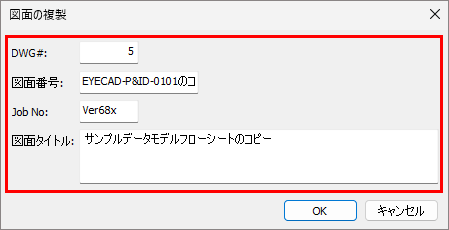 - 「①DWG#」は1~999を指定するとプラント属性の図面属性設定を参照します。既に使用しているDWG#を入力すると図面属性設定を参照し図面番号以降は変更できません。変更したい場合はプラント属性の図面属性設定で変更してください。未使用のDWG#であれば入力可能でここで設定した「①DWG#」「②図面番号」「③Job No」「④図面タイトル」「⑤用紙サイズ」が図面属性設定に反映します。