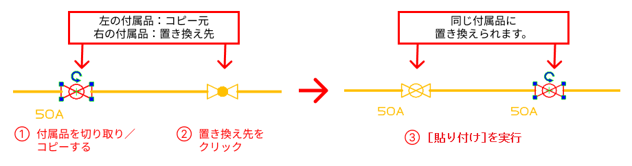 切り取りやコピーした配管部品(一般弁/配管付属品/計装品)をほかの配管部品に置き換えることができます。