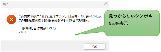 - 図面で使用しているシンボルがDBに見つからないと以下の警告を表示し、図面内にエラーシンボル:赤い四角×、が表示されます。