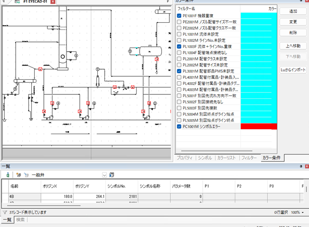エラーシンボルが赤色となる配管部品はデフォルトでカラー条件に設定済みです。