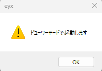 EYEPIPEライセンスがあり、EYEPIDライセンスがない場合、eyxはビューワーモードで起動します。以下のダイアログが現れたらOKを押します。ビューワーモードではP&ID図面の表示や3Dの連携表示は可能ですが、P&ID図面やカタログデータの変更、保存はできません。