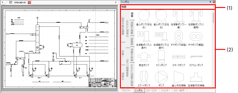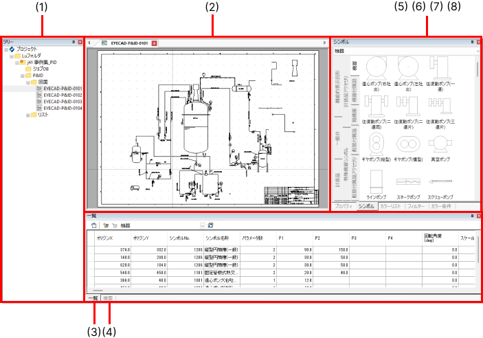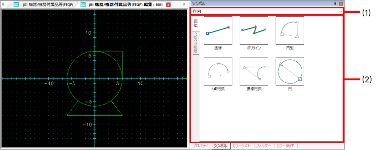 図面、シンボル一覧、リストなどの作業ウィンドウがタブ形式で表示されます。