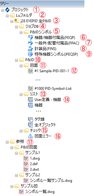 | ⑩ | "P&ID" | P&ID関連の全体ノードで、図面、リスト、チェックノードを子に持ちます。 |