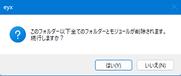 | 3 | 削除(D) | 現在選択しているフォルダー以下の全てのフォルダーとモジュールを削除します。以下のメッセージが現れ、「はい」で削除、「いいえ」で処理を中断します。![]() |