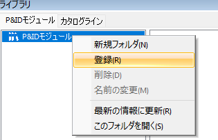 「編集」「モジュール登録」または「ライブラリウィンドウ」の「モジュール」で「P&IDモジュール」またはツリー上のフォルダーを選択し右クリックメニューの「登録」を選択