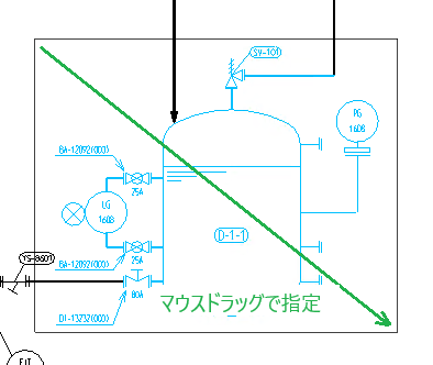 クリップして登録するときに左から右に囲むと領域内に完全に入っているオブジェクトを選択、右から左に囲むと領域内に一部でも入っていばそのオブジェクトを選択します。 左から右に囲むとき配管ラインや計装ラインは部品やエッジが完全に含まれるとそのライン全体が選択対象となり領域と交差する点でカットされます。 領域指定のときラインエッジの一部しか含めないと、そのライン自体が選択対象とならず交差する点でカットも行われません。 選択についてはオブジェクトの選択方法をご覧ください。