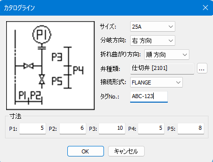 「カタログライン」ダイアログが現れるのでサイズ、分岐方向、パラメータ等を入力します。