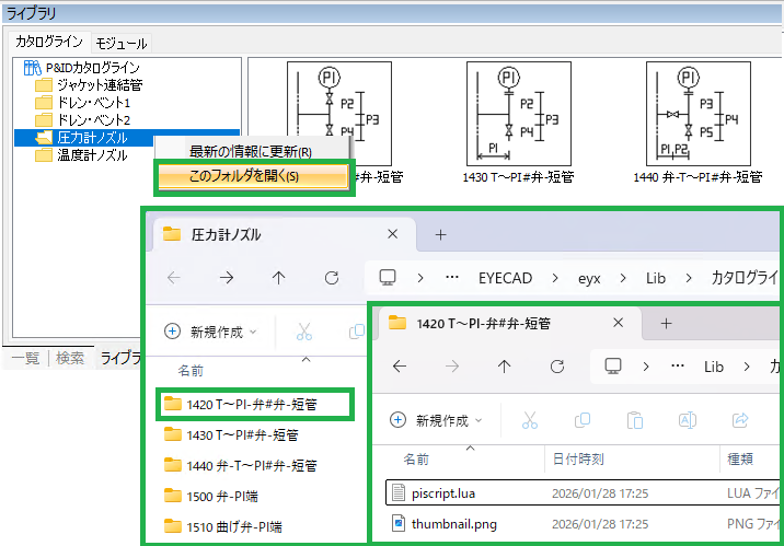 ツリーのフォルダーを右クリックして「このフォルダを開く」でそのフォルダーが開くと、そのカタログラインのフォルダーがあり、その下に上記ファイルがあります。