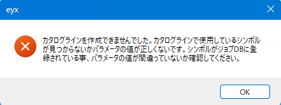 カタログラインの作成に失敗すると以下のダイアログが現れます。シンボルが登録されているかパラメータの値が間違ってないか確認してください。