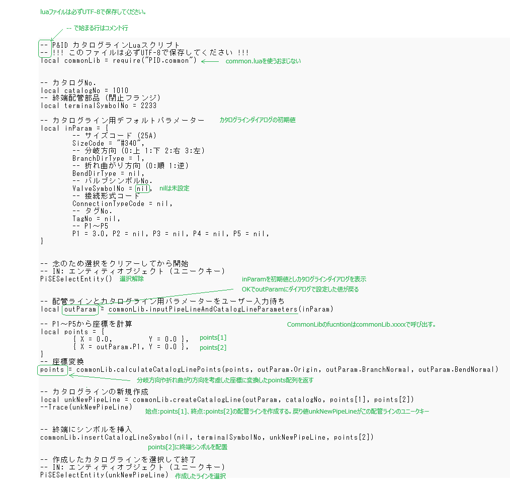 カタログラインは汎用スクリプト言語のluaで記述されています。カタログラインのスクリプトはEYEPIDで用意された基本コマンドとこれら基本コマンドを使って共通化したCommonLibコマンドを呼び出し配管カタログラインを作成します。luaに関して詳細は公式サイトをご覧ください。