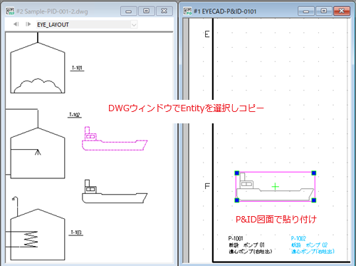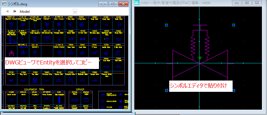 ウィンドウ内でEntityを選択、コピーしP&ID図面に任意図形コマ図、シンボルにDXF/DWGシンボルとして貼り付けることができます。