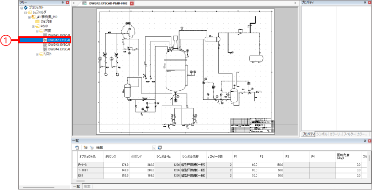 ツリーウィンドウで印刷したい図面(①)をダブルクリックし、メインウィンドウに図面を表示します。