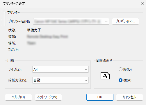 表示される[プリンターの設定]ダイアログで、設定内容を確認/変更します。