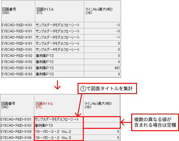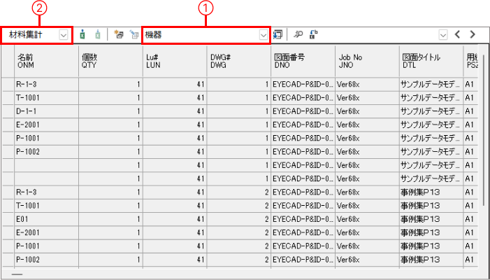 たとえば、以下のように[図面タイトル]列で[集計(同一判定)対象](①)を選択して、図面タイトルを洗い出します。