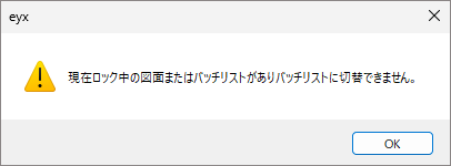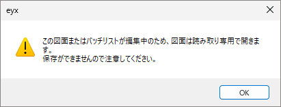 - リストタイプが[バッチ]の場合、図面はすべてロックされるため、保存できません。また、図面を開くと以下のようなメッセージが表示されます。