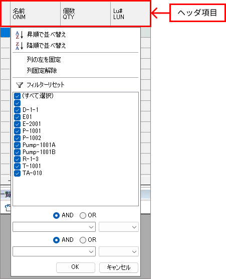 リストのヘッダ項目をクリックすると、各列用のドロップダウンフィルターメニューが表示され、行の並べ替えや絞り込みができます。