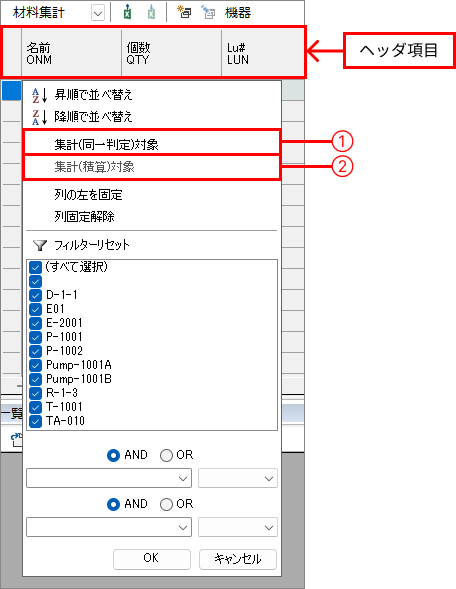 リストタイプが[材料集計]の場合、リストのヘッダ項目をクリックすると、ドロップダウンフィルターメニューに集計用の項目(①、②)が表示されます。リストの項目や値を集計することができます。