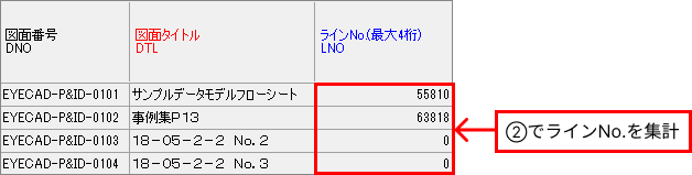 さらに[ラインNo.(最大4桁)]列で[集計(積算)対象](②)を選択すると、各図面タイトルに該当するラインNo.の合計値が表示されます。