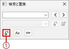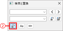 ツールバーで検索アイコン(①)をクリックします。または、置換モードの[検索と置換]ダイアログでアクティブな置換アイコン(②)をクリックしてオフに切り替えることで、検索モードに変更できます。