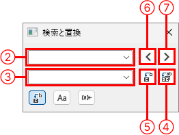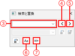 - ⑦をオンにすると、正規表現を使った検索ができます。正規表現についてはWeb等を参照してください。