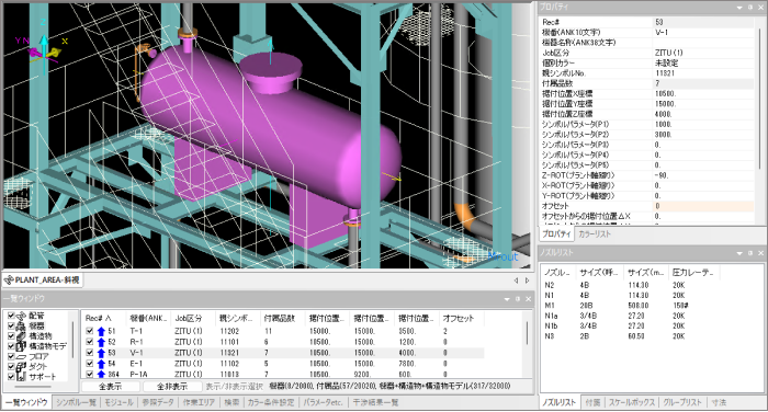 3D連携機能を使って、図面上の機器、配管ライン、計装品、配管付属品(タグNo.あり)、ノズル(ノズルNo.あり)を3Dモデリングプログラム上でズーム表示することができます。